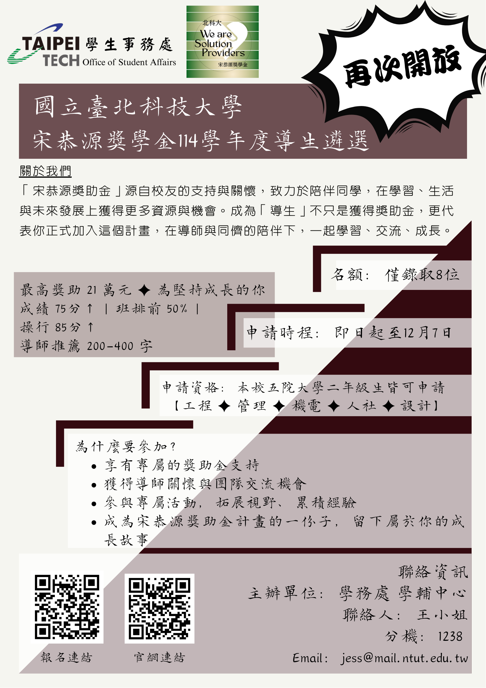 【加開申請】宋恭源獎助金導生遴選第二次開放報名