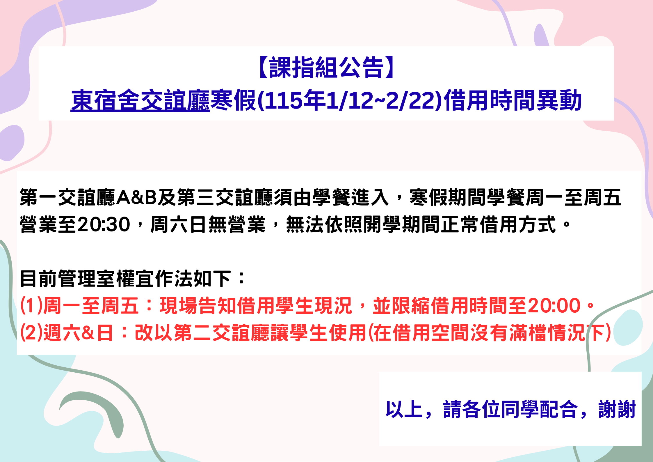 【課指組公告】東宿舍交誼廳寒假(115年1/12~2/22)借用時間異動