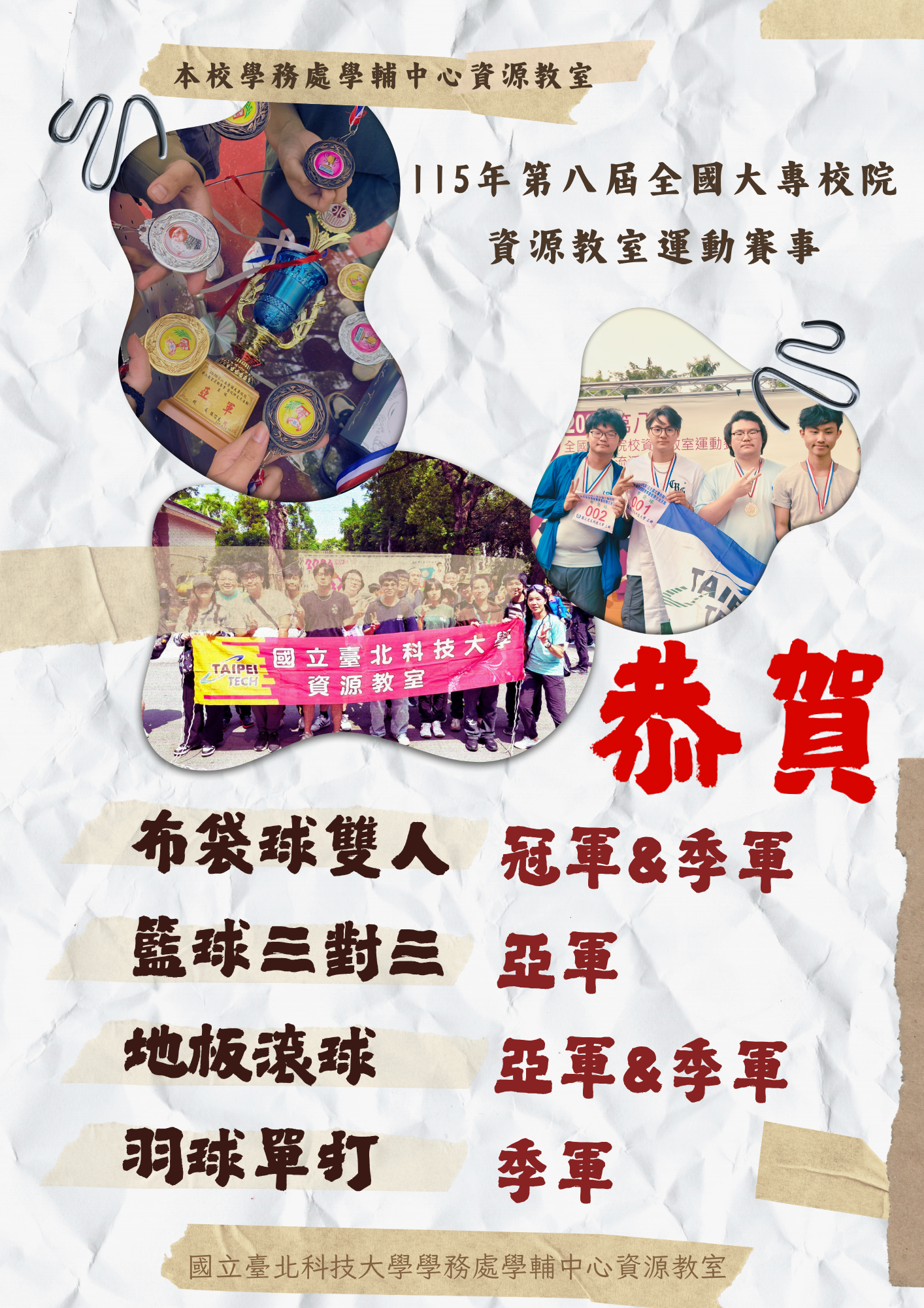 賀!本校參加「第八屆全國大專校院資源教室運動賽事暨校際交流活動」再創佳績,由電子系陳同學與土木系高同學攜手奪得布袋球雙人組冠軍,機械系余同學與智動科周同學榮獲季軍;電機系盧同學、半導體碩楊同學與北商大同學跨校組隊,榮獲籃球三對三團體賽亞軍;資財系王同學獲得地板滾球個人賽亞軍,分子系鄭同學與機械系林同學榮獲季軍(並列);土木系周同學亦於羽球單打項目奪得季軍,整體表現亮眼,令人振奮!